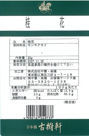 キンモクセイの花そのものを摘み取り、乾燥させたのがこの桂花。ゴマ入白玉団子の湯圓(タンエン)の香りづけとして、中華デザートには定番の存在です。お湯に入れたときに立ちのぼる甘い香りは、まさにキンモクセイの香りそのもの。また可憐で小さな黄色い花びらの1枚1枚が開いて、見た目にもとても愛らしいのです。お茶として飲むなら凍頂烏龍茶とブレンドするのもおすすめです。