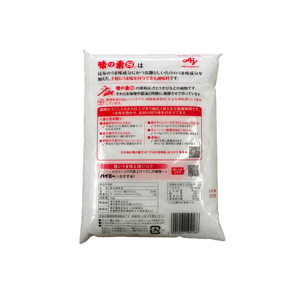 昆布のうま味成分にかつおぶしとしいたけのうま味成分を加えた、少量で手軽に料理をおいしくできるうま味調味料です。一般向けの味の素がL-グルタミン酸ナトリウム97.5%配合に対し、業務用の味の素SはL-グルタミン酸ナトリウム99%、5'-リボヌクレオタイドナトリウムが1%配合されています。素材本来の持ち味を引きたて、料理の味のバランスをととのえます。